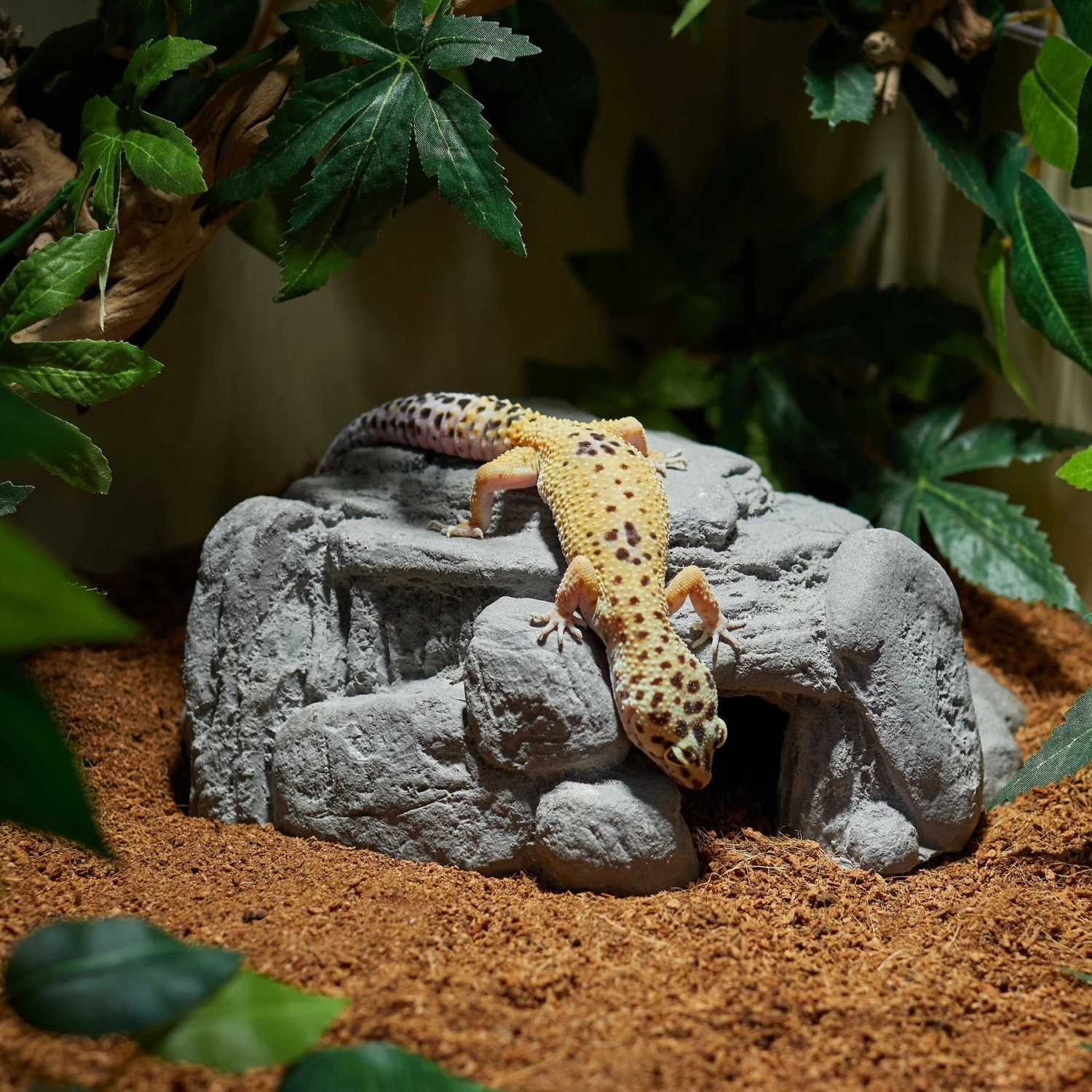- Natural hide that is designed to blend into your terrarium.