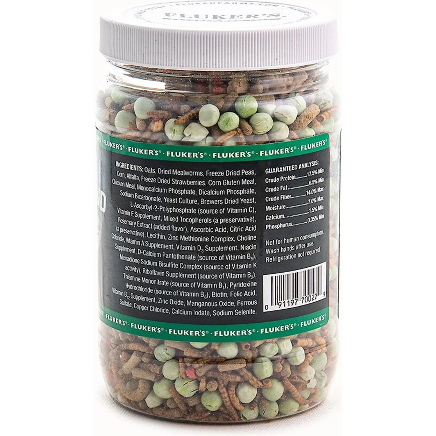 - Contains mealworms, green peas, vitamin pellets, and strawberries.