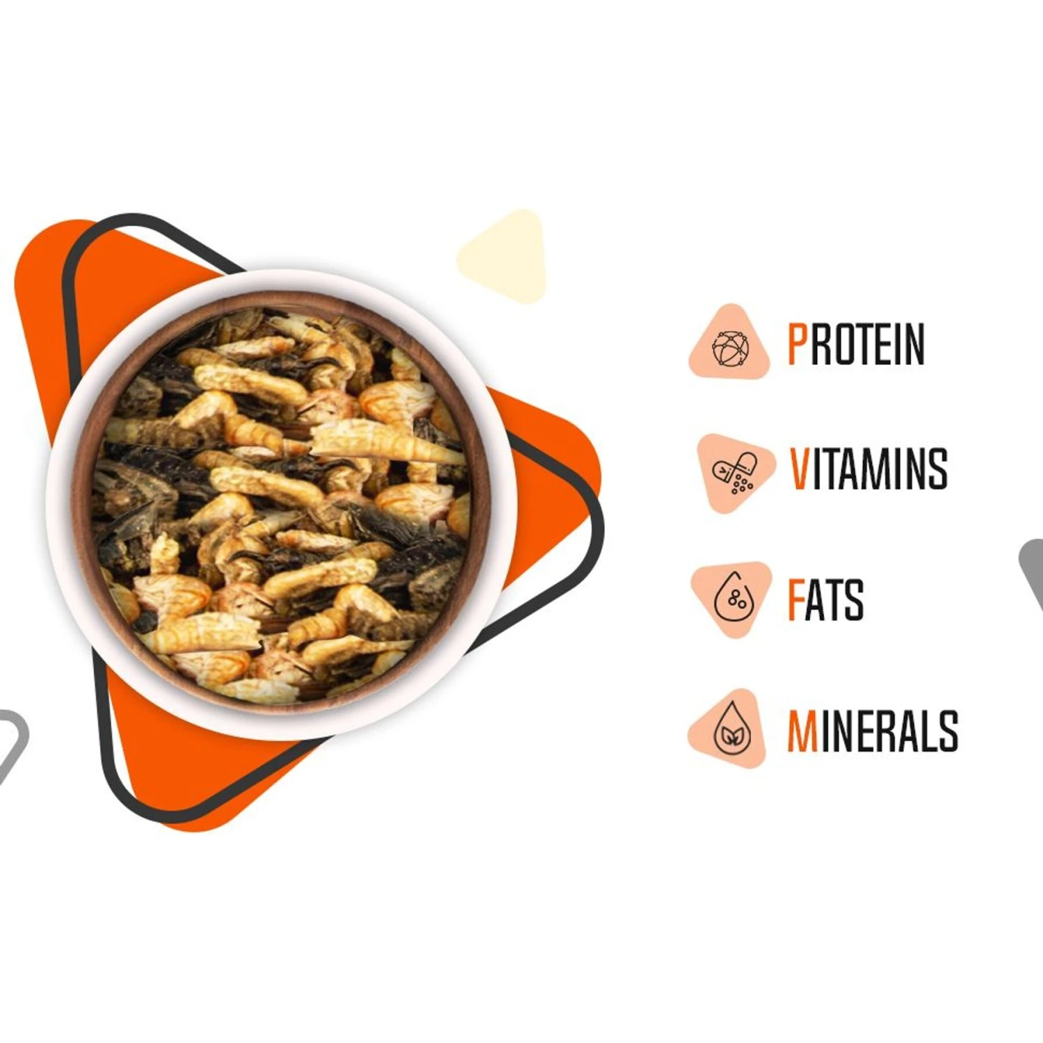 - Made from 100% natural river shrimps, mealworms and crickets without any preservatives, fillers, chemicals, salt or artificial ingredients.
