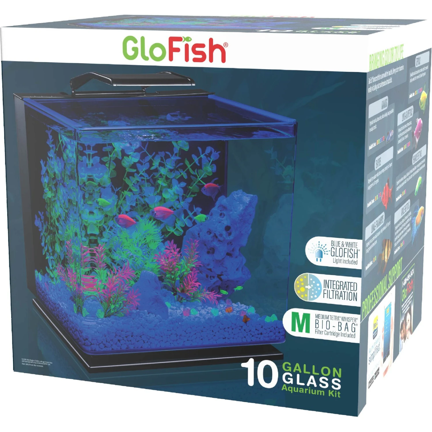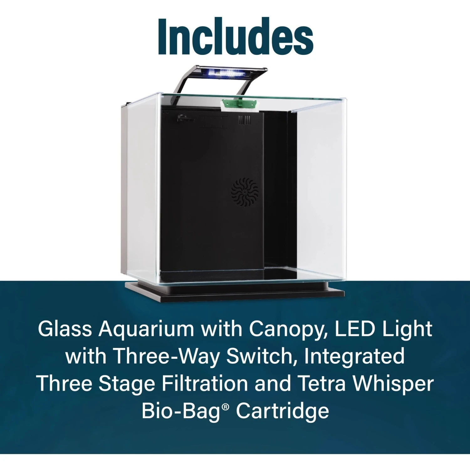 - Each kit includes a 10-gallon aquarium tank with glass canopy, a 55 gallons-per-hour flow rate filter with medium Tetra Whisper Bio-Bag Cartridge, LED lights plus a three-way light switch.