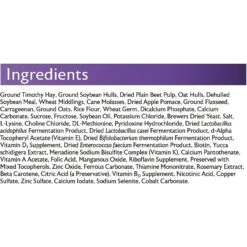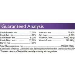 - Expect high fiber and low starch levels with this grass hay-based diet.