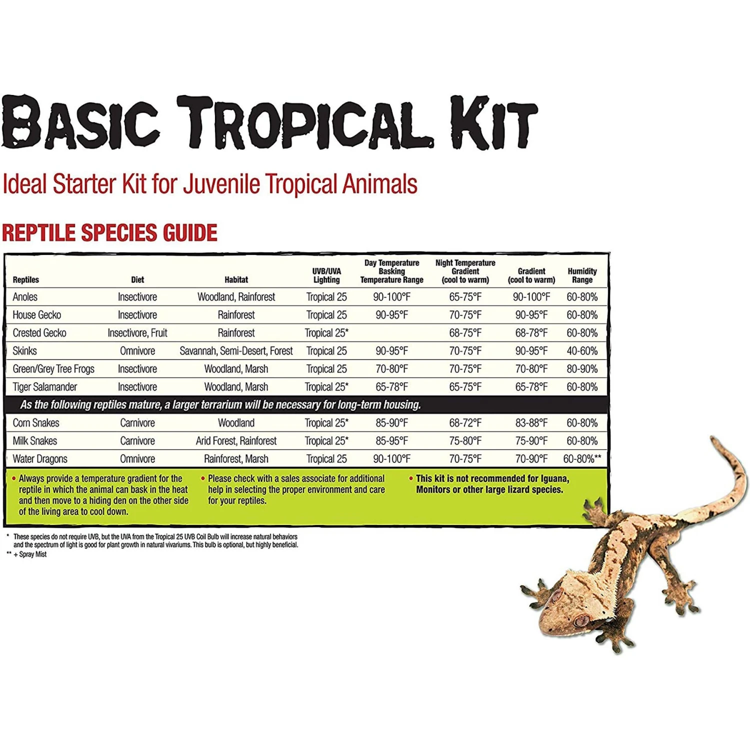 - Complete kit lets you get started raising tropical-dwelling reptiles from juveniles, with glass enclosure, substrate liner, light and heated mat, gauge and set-up guide.
