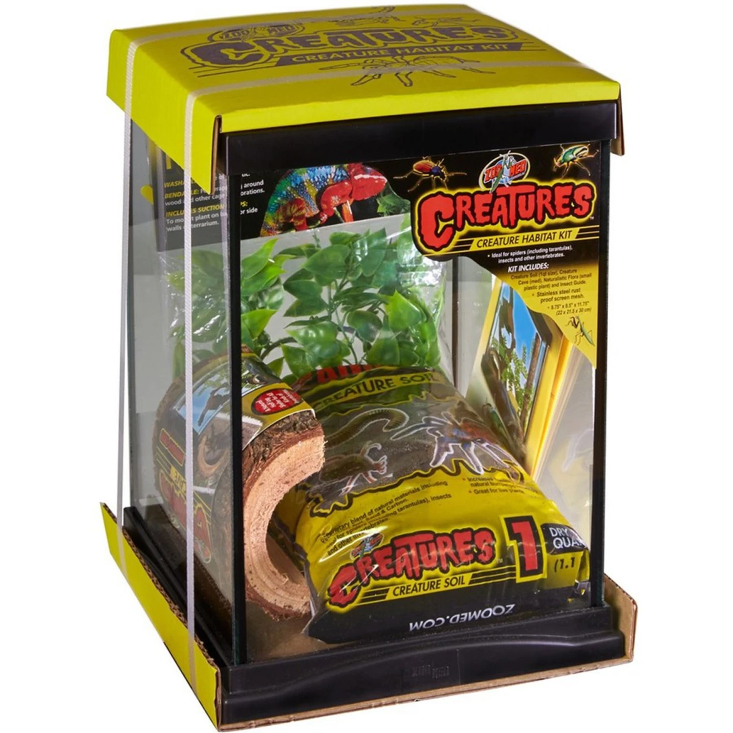 - Includes an insect guide, wooden cave, soil substrate and plastic plant décor.