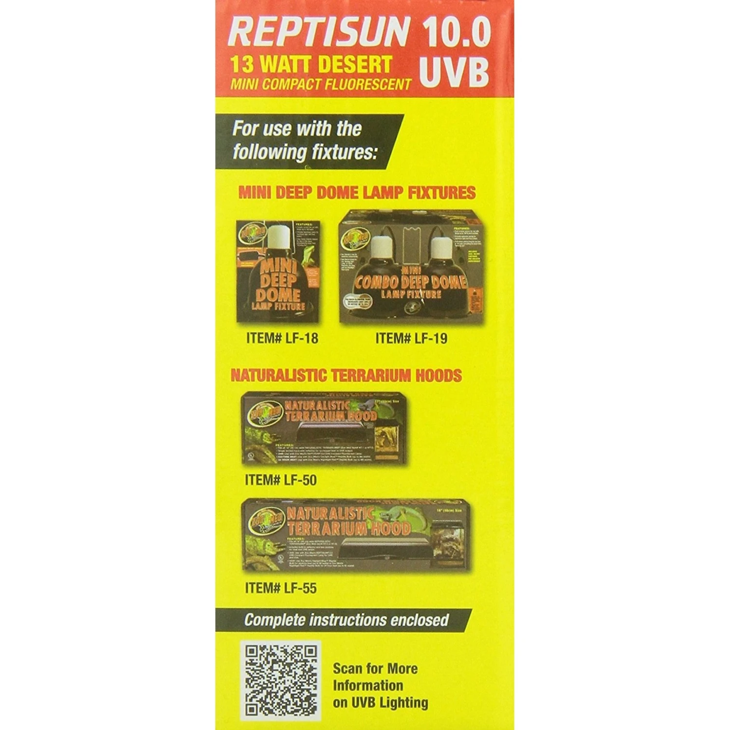 ReptiSun 10.0 Mini is perfect for all desert and basking reptiles! 10% UVB Output, 30% UVA Output, full spectrum bulb. The new ReptiSun Mini Compact Fluorescent lamps use a special UVB transmitting quartz glass for maximum UVB penetration. Cool burning compact fluorescent bulbs screw into standard threaded sockets, eliminating the need for a separate ballast. Lamp can be oriented either vertically or horizontally in your reptile hood or clamp lamp fixture. UVB emissions help prevent or reverse metabolic bone disease and UVA increases feeding, mating, and other natural behaviors.